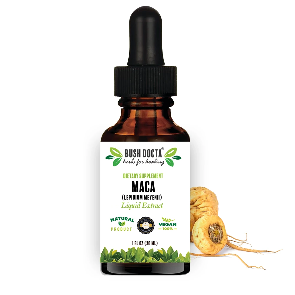 Our Bush Docta Maca Liquid Extract is derived from high-quality maca root, celebrated for its energy-boosting properties. Traditionally used to enhance stamina, endurance, and vitality, maca also helps balance hormones and support reproductive health. It is rich in essential nutrients and antioxidants, which support overall well-being. This potent liquid extract is easy to incorporate into your daily routine by adding it to water, juice, or your favorite beverage. Perfect for anyone looking to naturally increase their energy levels and support hormonal balance. (1 oz | 112 g)
