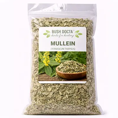 Mullein is a soft, velvety-leafed plant traditionally used throughout Europe and North America for generations. Known for its tall flowering stalk and fuzzy leaves, mullein has long been valued in herbal traditions for respiratory and seasonal wellness practices. Our Bush Docta Mullein Leaf is carefully dried to preserve its light green color and delicate texture, making it ideal for soothing herbal infusions. (4 oz | 112 g)